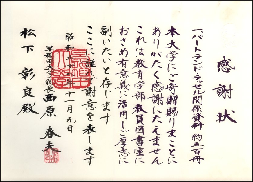 ・1983年,松下所有のラッセル関係資料約1,800点を(数回に分けて)早稲田大学教育学部に寄贈して,教育学部教員図書室内に「ラッセル関係資料コーナー」(通称「ラッセル文庫」)を創ってもらう。(西村春夫総長より感謝状をいただく。)