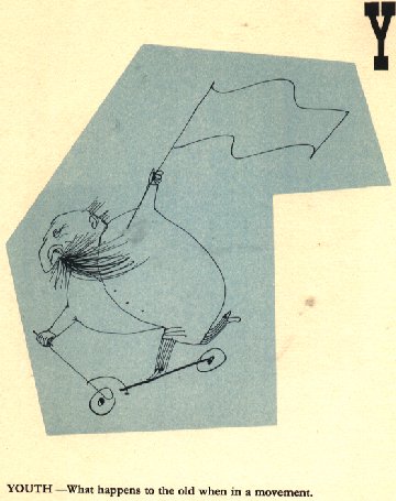 私はまた,彼が,1905年に,パリのホテルに泊まっていた私に会いに来てくれたことを記憶している。その時,(クロムプトン・デービス及びセオドール・デービスの父親)デービス氏とその娘のマーガレットが,彼の話に耳をかたむけていた。彼は,かたときもやすまずに30分もの間,しゃべり続けこう言った--「賢い人とは,黙っている人のことである。」--。その瞬間,デーヴィス氏は,80歳の老齢にもかかわらず突如として部屋から飛び出した。そうして彼が姿を消すと同時に,彼の笑い声が私に聞こえてきた(右下欄イラスト出典:B. Russell's The Good Citizen's Alphabet, 1953.)。