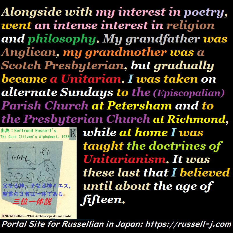 Alongside with my interest in poetry, went an intense interest in religion and philosophy. My grandfather was Anglican, my grandmother was a Scotch Presbyterian, but gradually became a Unitarian. I was taken on alternate Sundays to the (Episcopalian) Parish Church at Petersham and to the Presbyterian Church at Richmond, while at home I was taught the doctrines of Unitarianism. It was these last that I believed until about the age of fifteen.