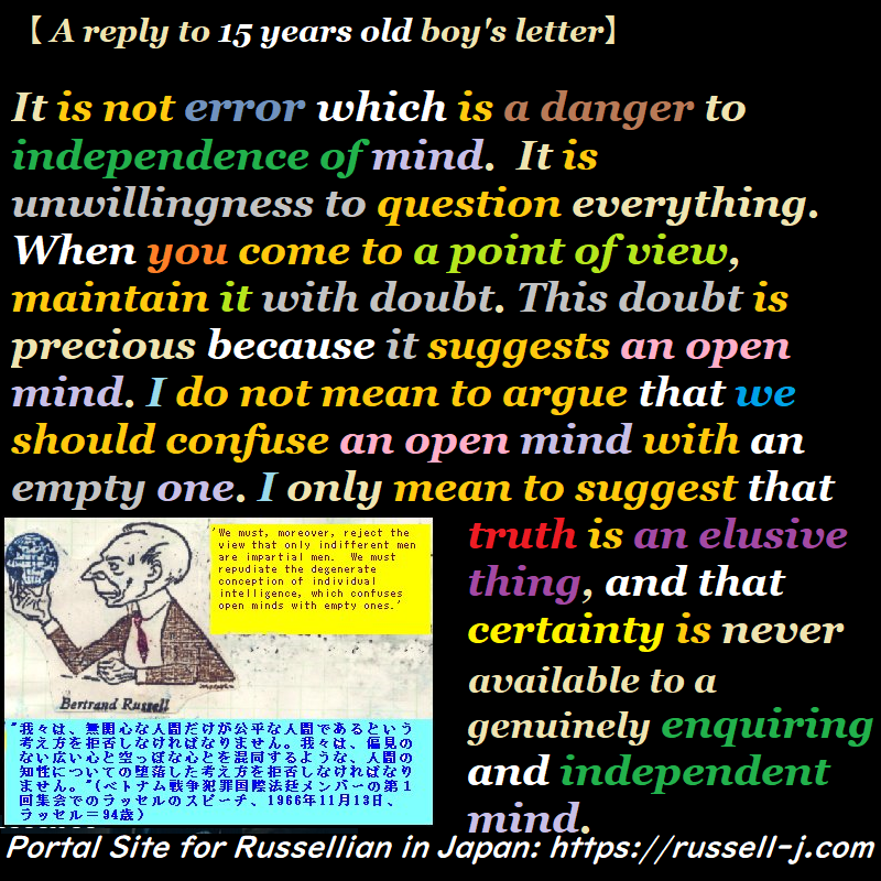 It is not error which is a danger to independence of mind. It is unwillingness to question everything. When you come to a point of view, maintain it with doubt. This doubt is precious because it suggests an open mind. I do not mean to argue that we should confuse an open mind with an empty one. I only mean to suggest that truth is an elusive thing, and that certainty is never available to a genuinely enquiring and independent mind. (Mar. 21, 1963)