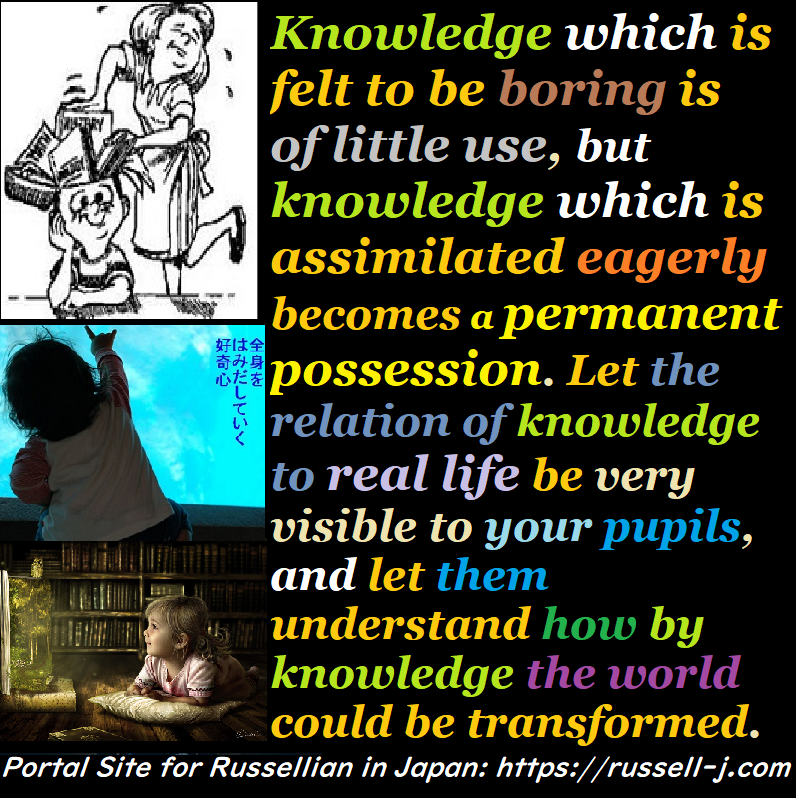 Knowledge which is felt to be boring is of little use, but knowledge which is assimilated eagerly becomes a permanent possession. Let the relation of knowledge to real life be very visible to your pupils, and let them understand how by knowledge the world could be transformed.