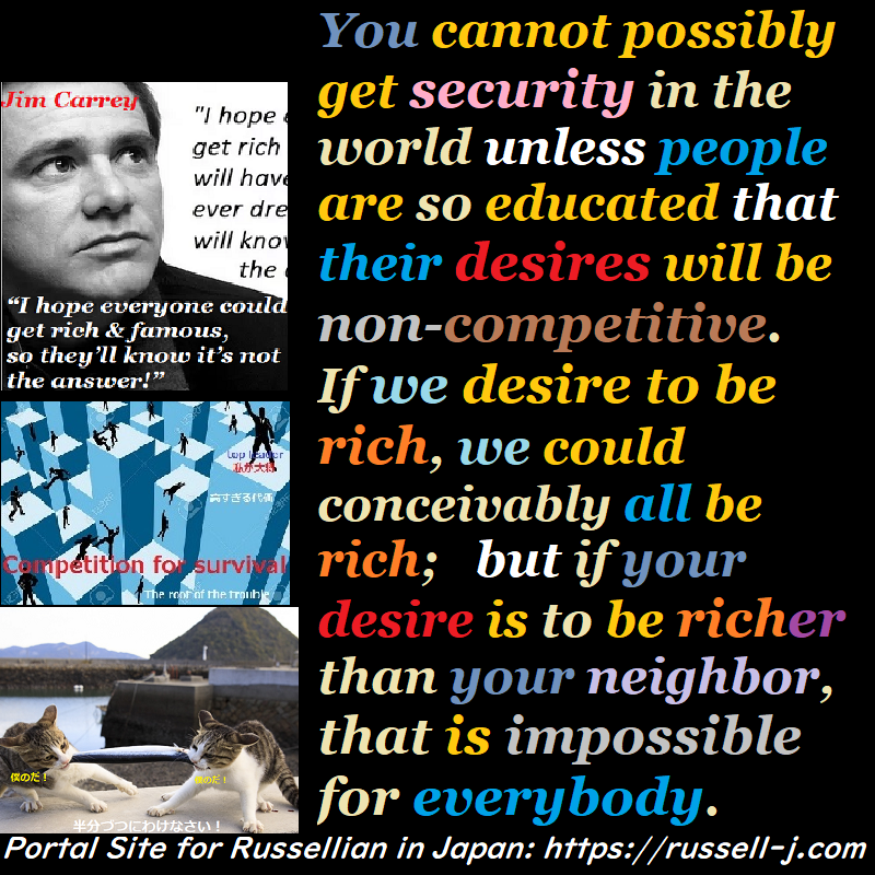 You cannot possibly get security in the world unless people are so educated that their desires will be non-competitive. If we desire to be rich, we could conceivably all be rich; but if your desire is to be richer than your neighbor, that is impossible for everybody.
