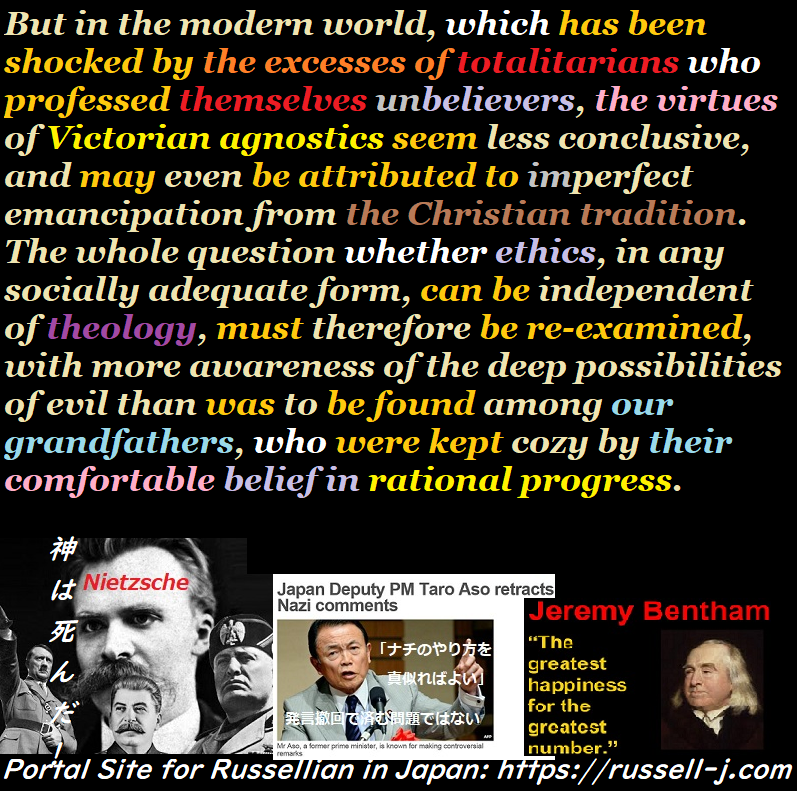 But in the modern world, which has been shocked by the excesses of totalitarians who professed themselves unbelievers, the virtues of Victorian agnostics seem less conclusive, and may even be attributed to imperfect emancipation from the Christian tradition. The whole question whether ethics, in any socially adequate form, can be independent of theology, must therefore be re-examined, with more awareness of the deep possibilities of evil than was to be found among our grandfathers, who were kept cozy by their comfortable belief in rational progress.
