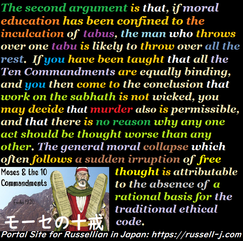 The second argument is that, if moral education has been confined to the inculcation of tabus, the man who throws over one tabu is likely to throw over all the rest. If you have been taught that all the Ten Commandments are equally binding, and you then come to the conclusion that work on the sabhath is not wicked, you may decide that murder also is permissible, and that there is no reason why any one act should be thought worse than any other. The general moral collapse which often follows a sudden irruption of free thought is attributable to the absence of a rational basis for the traditional ethical code.