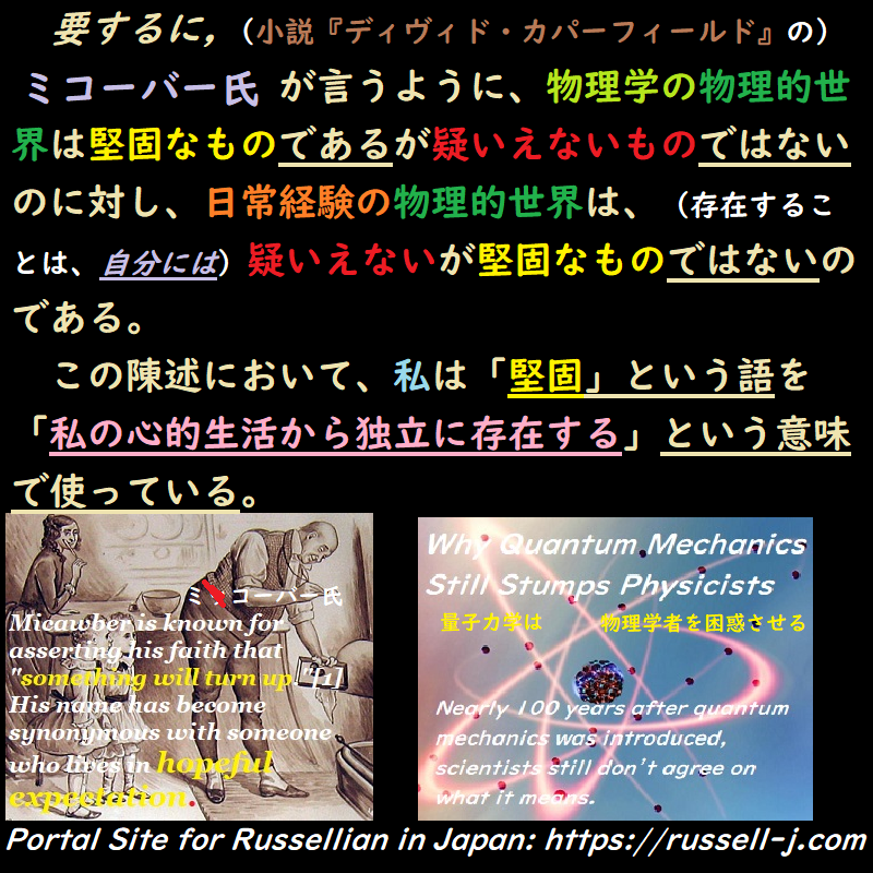 In short, as Mr. Micawber would say, the physical world of physics is solid but not indubitable, while the physical world of daily experience is indubitable but not solid. In this statement I am using the word "solid" to mean "existing independently of my mental life."