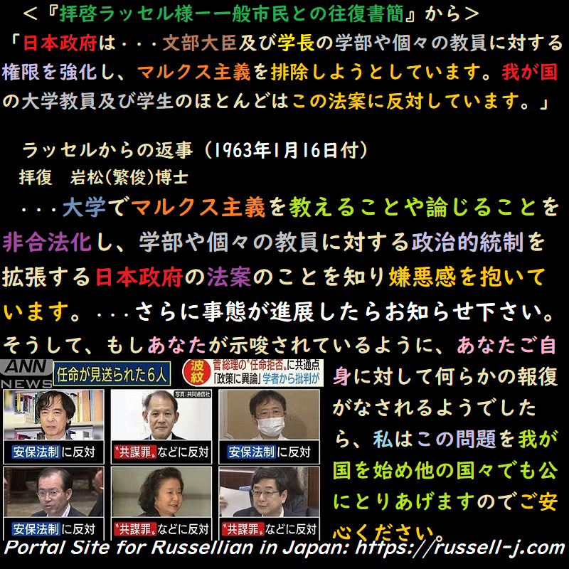 ラッセルは反共産主義者としてよく知られていますが、同時に思想・信条の自由を最重要視しています。そのことを理解しないで、ラッセルを容共主義者だと非難する人が少なくないのは残念です。(なお、岩松繁俊長崎大学名誉教授は昨年9月に92歳で亡くなられました。岩松教授は被爆者であり、原水爆禁止国民会議の議長を10年間務められました。お会いしたのは一度だけですが、年賀状の交換だけは長年していました。)