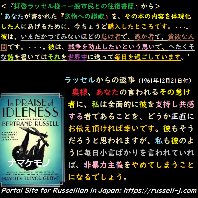 '・・・あなた(ラッセル)が書かれた『怠惰への讃歌』を、その本の内容を体現化した人にあげるために、今ちょうど購入したところです。・・・。彼は、いまだかつてみないほどの怠け者で、愚か者で、貧欲な人間です。・・・。彼は、戦争を防止したいという思いで、へたくそな詩を書いてはそれを世界中に送って毎日を過ごしています。・・・彼のような怠け者にベルトを締めなおさせるにはどうしたらよいでしょうか?'