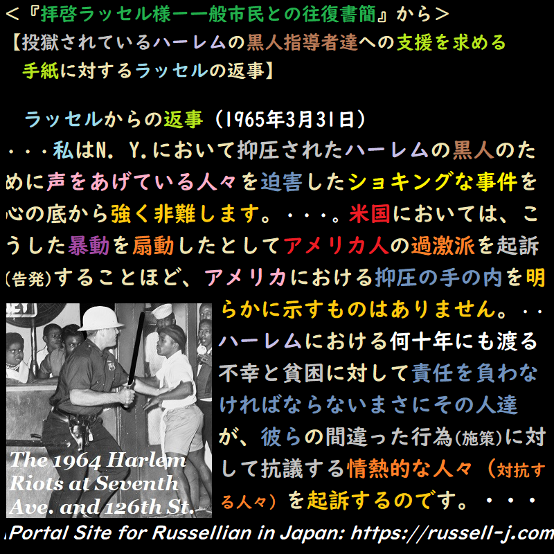【投獄されているハーレムの黒人指導者達への支援を求める手紙に対するラッセルの返事】
