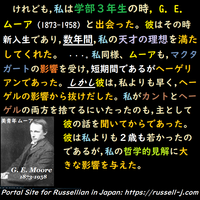 ラッセルは1872年5月18日生まれでムーア(George Edward Moore, 1873-1958)は1873年11月4日生まれなので、正確にいうと1歳半年下ということになります。2歳年下という言い方は少し誤解を与えそうです。