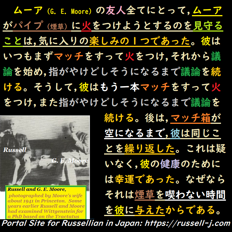 ラッセルが生きていた時代は、煙草の健康リスクについてやかましく言われていなかった時代でした。また、1948年10月、ラッセルが搭乗していた(オスロからトロンハイム行きの)水上飛行艇が北海に墜落しましたが、(ラッセルを含め)喫煙室にいた人だけが助かりました。そういうわけで、人から煙草の健康リスクを言われても、「喫煙習慣のために自分は命が助かった」と「煙(かむ)に巻いて」、喫煙習慣をやめることはありませんでした。