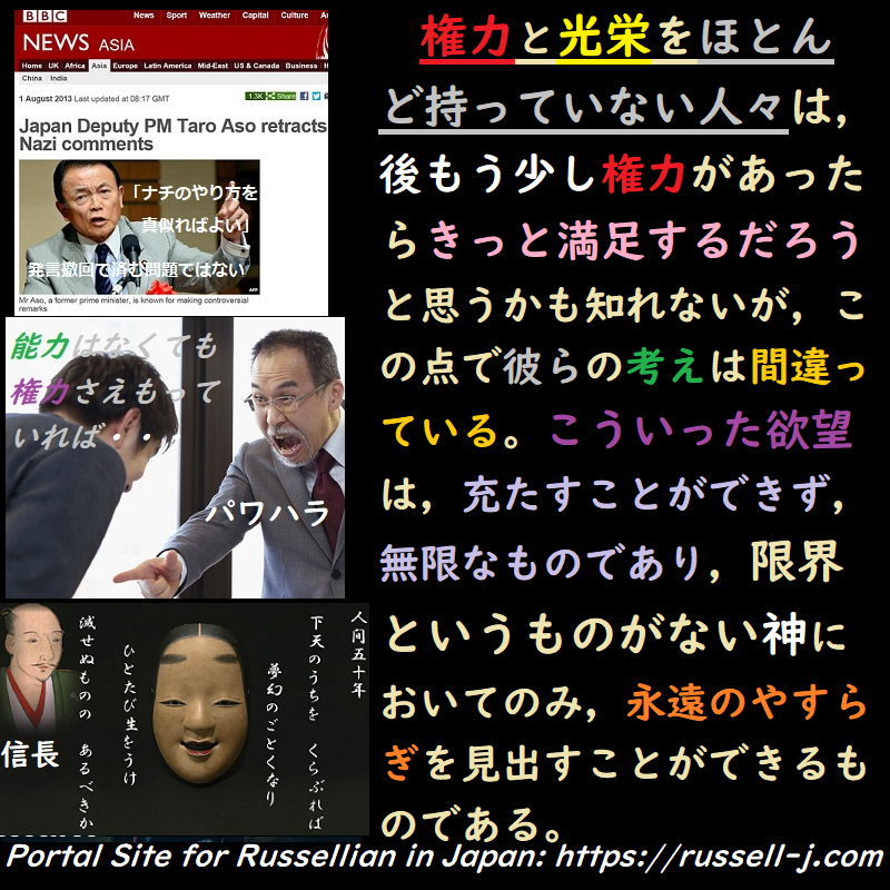 権力と光栄をほとんど持っていない人々は,後もう少し権力があったらきっと満足するだろうと思うかも知れないが,この点で彼らの考えは間違っている。こういった欲望は,充たすことができず,無限なものであり,限界というものがない神においてのみ,永遠のやすらぎを見出すことができるものである。