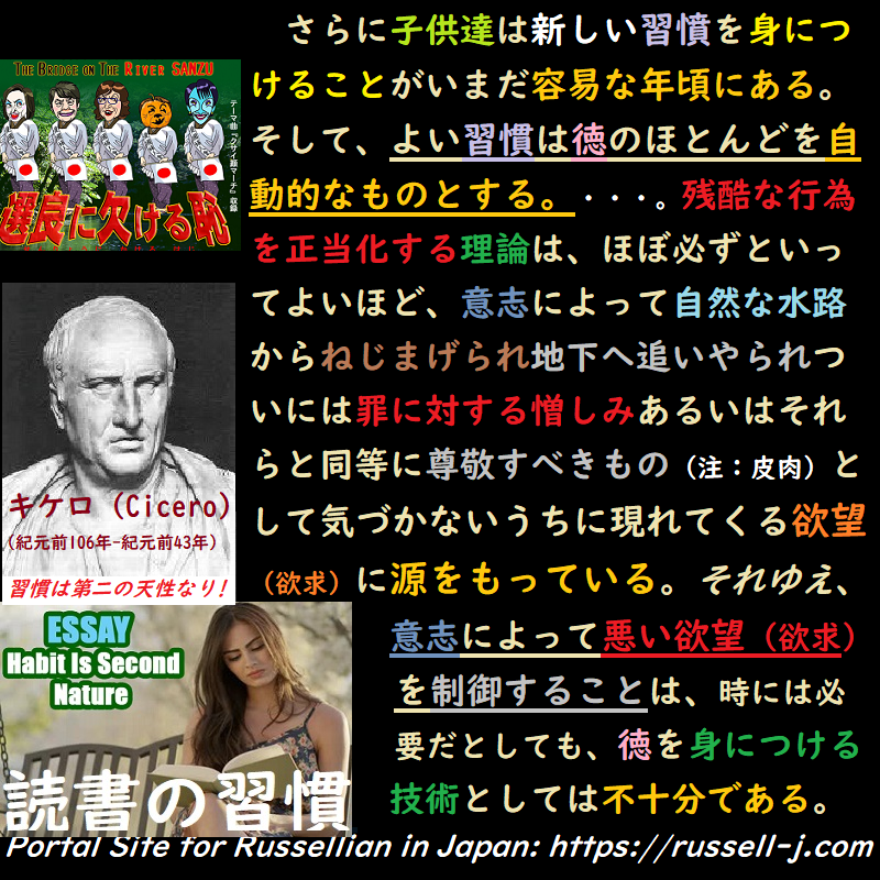 さらに子供達は新しい習憤を身につけることがいまだ容易な年頃にある。そして、よい習慣は徳のほとんどを自動的なものとする.・・・。残酷な行為を正当化する理論は、ほぼ必ずといってよいほど、意志によって自然な水路からねじまげられ地下へ追いやられついには罪に対する憎しみあるいはそれらと同等に'尊敬すべきもの(注:皮肉)として気づかないうちに現れてくる 欲望(欲求)に源をもっている。それゆえ、意志によって悪い欲望(欲求)を制御することは、時には必要だとしても、徳を身につける技術としては不十分である。