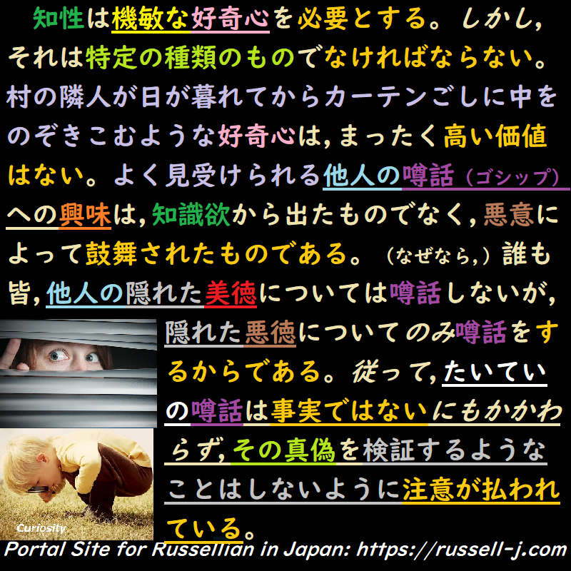知性は機敏な好奇心を必要とする。しかし,それは特定の種類のものでなければならない。村の隣人が日が暮れてからカーテンごしに中をのぞきこむような好奇心は,まったく高い価値はない。よく見受けられる他人の噂話(ゴシップ)ヘの興味は,知識欲から出たものでなく,悪意によって鼓舞されたものである。(なぜなら,)誰も皆,他人の隠れた美徳については噂話しないが,隠れた悪徳についてのみ噂話をするからである。従って,たいていの噂話は事実ではないにもかかわらず,その真偽を検証するようなことはしないように注意が払われている。