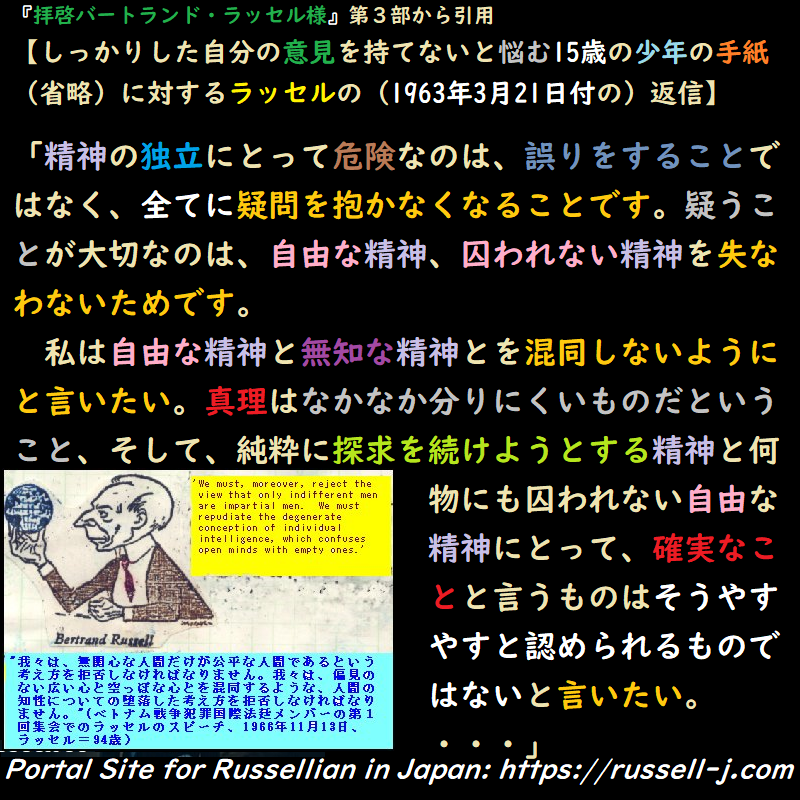 【しっかりした自分の意見を持てないと悩む15歳の少年の手紙(省略)に対するラッセルの(1963年3月21日付の)返信】