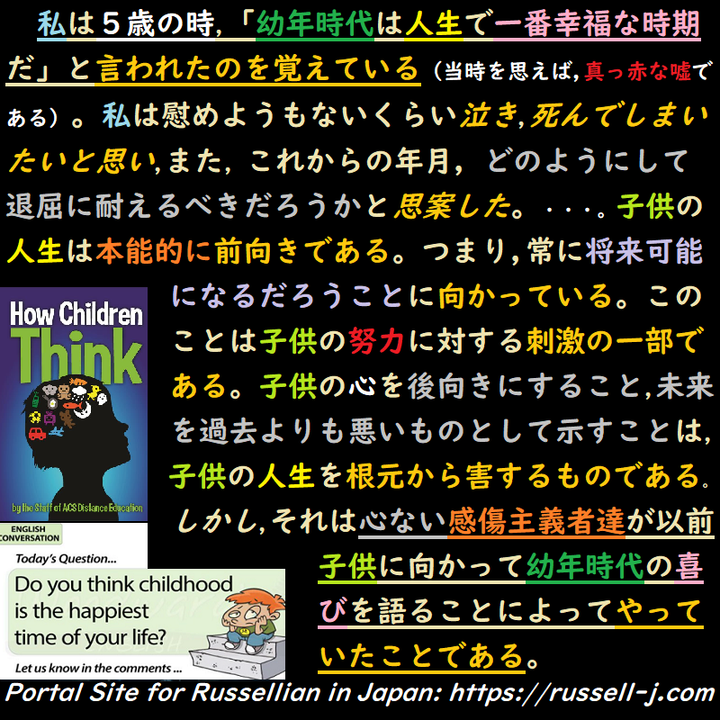 私は5歳の時,「幼年時代は人生で一番幸福な時期だ」と言われたのを覚えている(当時を思えば,真っ赤な嘘である)。私は,慰めようもないくらい泣き,死んでしまいたいと思い,また,これからの年月,どのようにして退屈に耐えるべきだろうかと思案した。・・・。子供の人生は,本能的に前向きである。つまり,常に,将来可能になるだろうことに向かっている。このことは,子供の努力に対する刺激の一部である。子供の心を後向きにすること,未来を過去よりも悪いものとして示すことは,子供の人生を根元から害するものである。しかし,それは,心ない感傷主義者達が,以前,子供に向かって幼年時代の喜びを語ることによってやっていたことである。