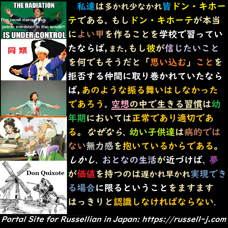 私達は、多かれ少なかれ、皆,ドン・キホーテである。もしドン・キホーテが本当によい甲を作ることを学校で習っていたならば、また、もし彼が信じたいことを何でもそうだと「思い込む」ことを拒否する仲間に取り巻かれていたならば、あのような振る舞いはしなかったであろう。空想の中で生きる習慣は、幼年期においては正常であり、適切である。なぜなら、幼い子供達は、病的ではない無力感を抱いているからである。しかし、おとなの生活が近づけば、夢が価値を持つのは遅かれ早かれ実現できる場合に限るということをますますはっきりと認識しなければならない。